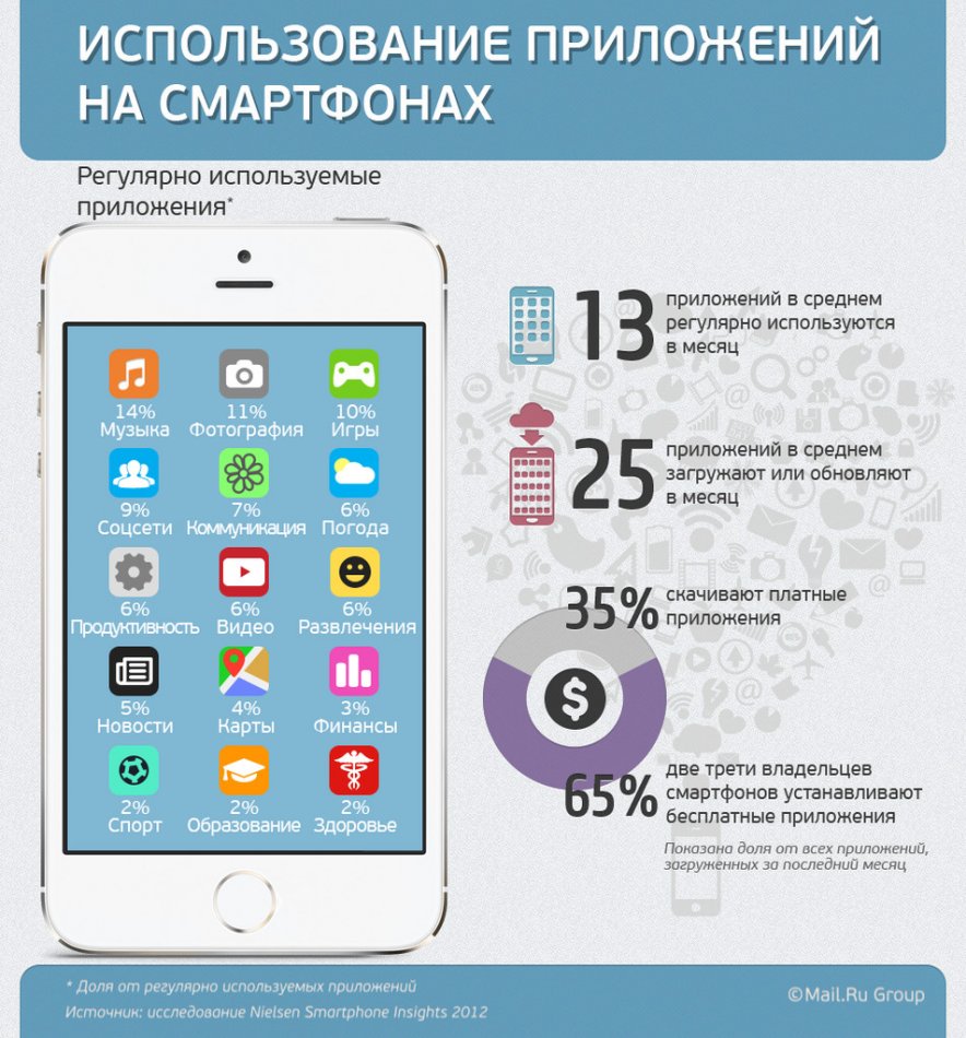 Среди мобильных приложений лидерство принадлежит платформе Android (72%), далеко позади пользователи приложений для iOS (26%). Однако владельцы iPhone и iPad пользуются программами активнее — ежемесячно они используют около 25 приложений, тогда как Android-пользователи — лишь 11–15.