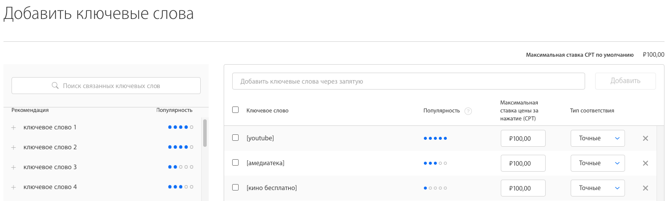 Для большей управляемости и последующей оценки performance-показателей рекомендуем использовать [точное] соответствие.
