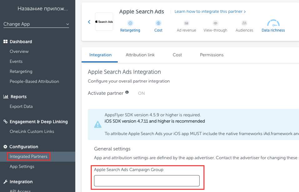 Appsflyer → в integrated partners → Apple Search Ads → указать Campaign Group ID