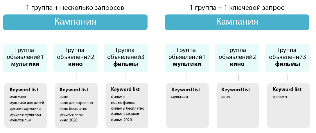- Single keyword per Ad Group (SKAG) — 1 ад группа = 1 ключевое слово;