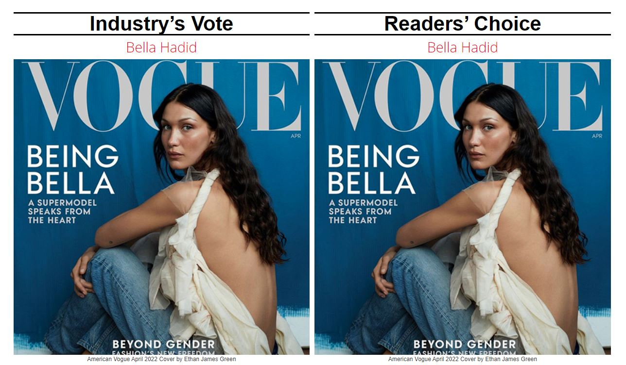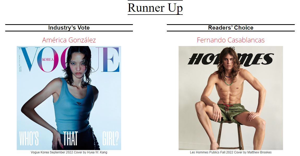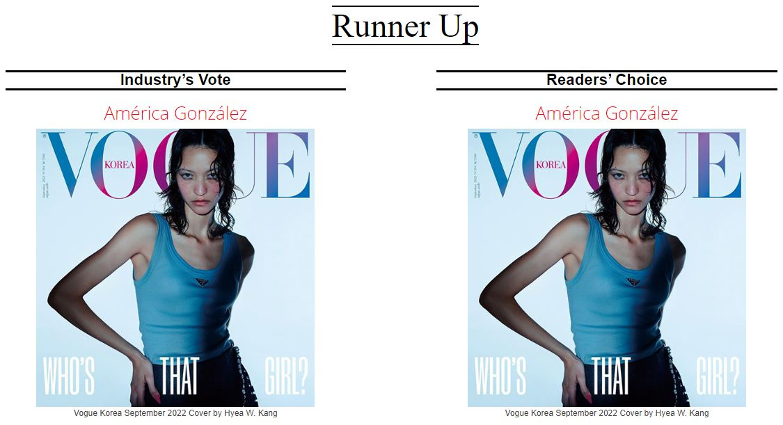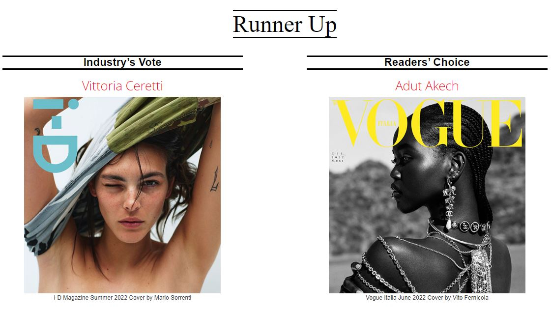 Второе место по версии профессионалов получила итальянская топ-модель Виктория Черетти. Читатели присудили это место южносуданско-австралийской модели Адут Акеч.