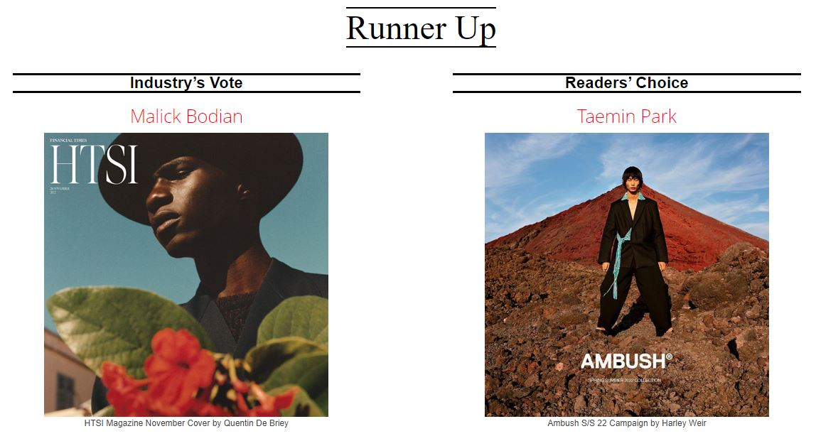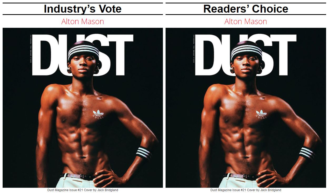 Среди мужчин моделью года жюри и читатели единодушно выбрали Элтона Мейсона. Второе место эксперты присудили Малику Бодиану, а читатели — корейца Теймина Парка.