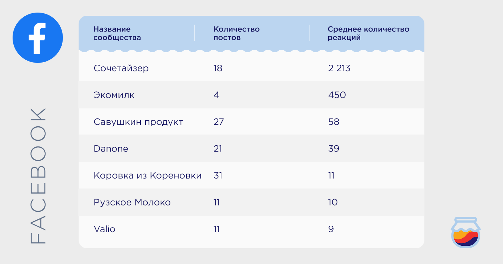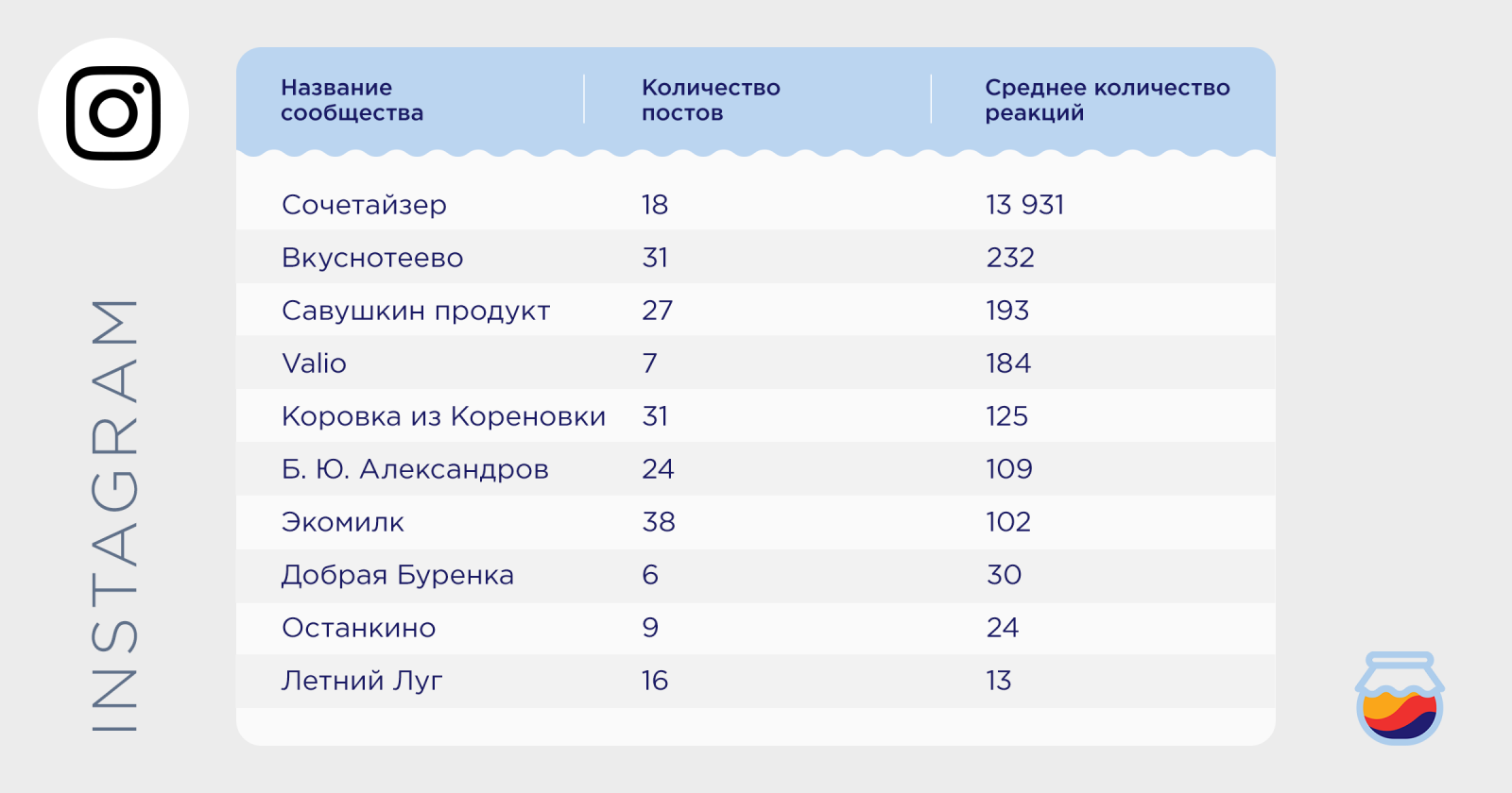 Sostav совместно с сервисом аналитики активности брендов в соцмедиа JagaJam проанализировали активности в соцмедиа наиболее популярных брендов молока и молочных продуктов в июле 2019 года. Ранее, мы уже проводили анализ активности брендов безалкогольных напитков в мае 2019 г., а также автомобилей и автодилерских центров в июне 2019 года.
