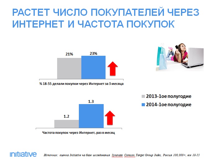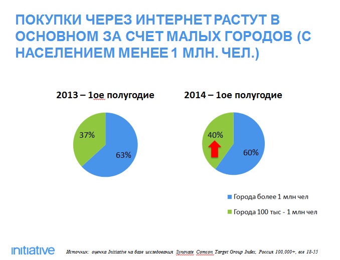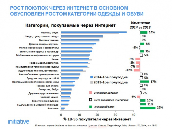 Агентство Initiative проанализировало рынок онлайн-покупок в России. Популярность онлайн-шоппинга в нашей стране продолжает расти. При этом количество покупателей через Интернет и частота покупок увеличивается за счет малых городов с населением менее 1 млн человек. Самые востребованные товары у российских интернет-пользователей - одежда и обувь. Также в ТОП-5 покупаемых товаров вошли: готовая еда, бытовая техника, детские товары и игрушки, Ж/Д и авиабилеты.