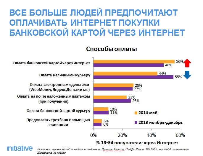 Все больше покупателей предпочитают оплачивать покупки в онлайн-магазинах банковскими картами через интернет. Этот вид оплаты остается самым распространённым и удобным, им пользуются 56% покупателей, что на 8% больше, чем в прошлом году. Почти на 10% уменьшилось количество покупателей, оплачивающих покупки наличными деньгами через курьера, однако этот способ все еще является одним из самых востребованных – его выбирают 44% покупателей. 28% оплачивают товар электронными деньгами; 10% расплачиваются банковской картой курьеру и только 6% предпочитают предоплату через банк с помощью квитанции.
