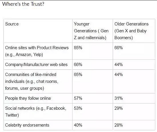 Опрошенные отмечают, что если их заинтересует какой-либо продукт или услуга, они знают, где искать их. Когда они заходят в соцсеть, то хотят узнать новости от друзей, а не от брендов. Согласно опросу, сайты с обзорами (Amazon, Yelp и т.д.), а также корпоративные сайты пользуются у молодежи большим доверием, чем соцсети и рекомендации знаменитостей.