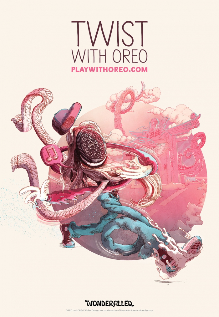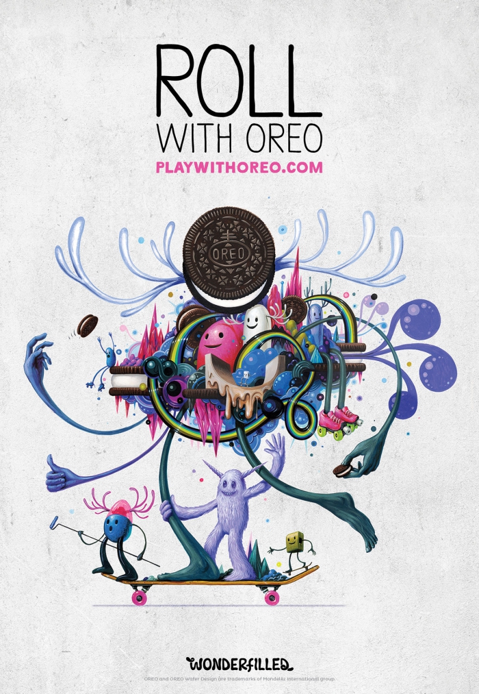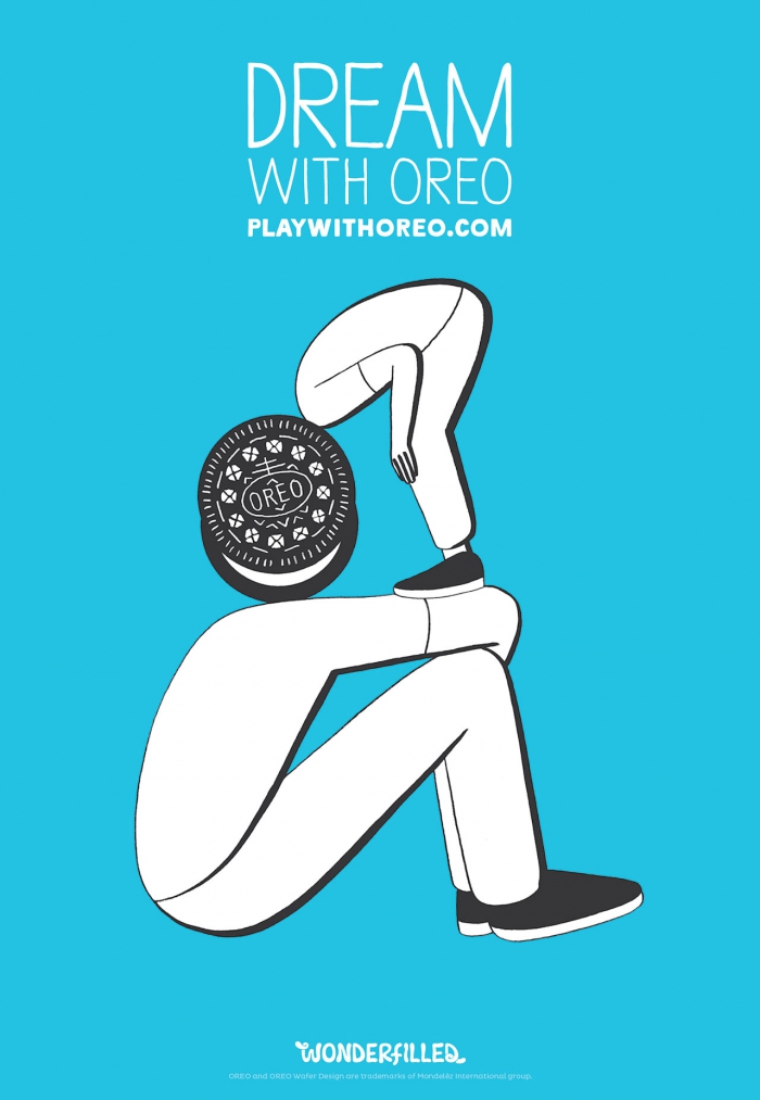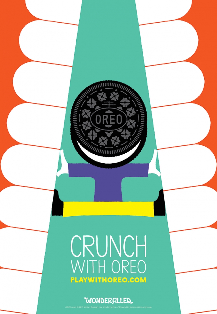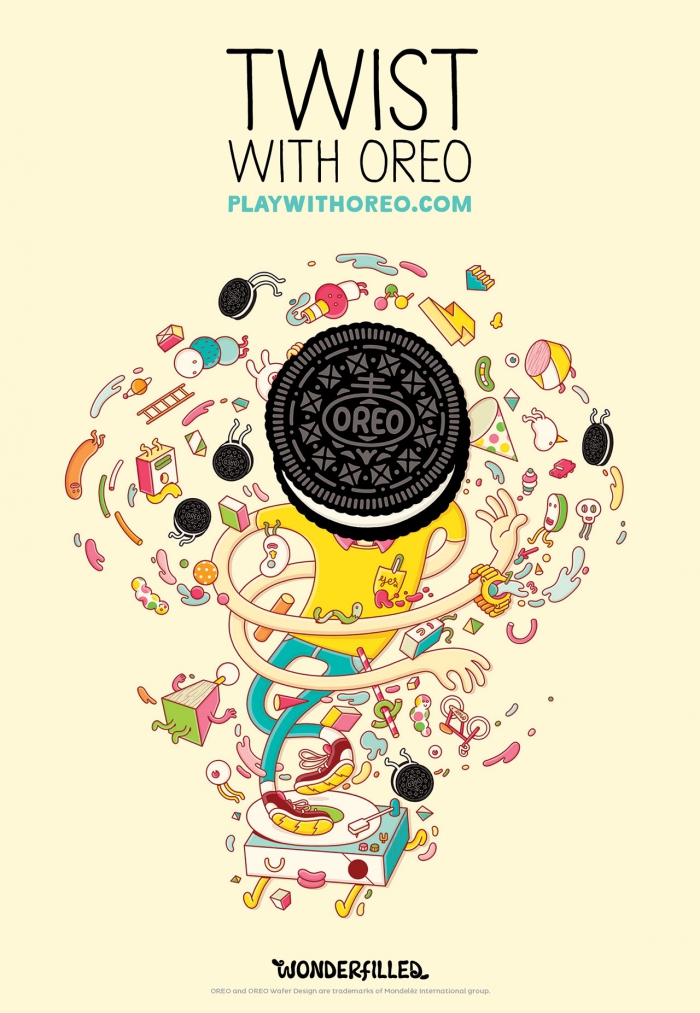Американский бренд печенья Oreo (Mondelez International, Inc.) и креаторы агентства The Martin Agency пригласили молодых художников принять участие в разработке продолжения январской рекламной кампании "Поиграй с Oreo". 10 молодых художников со всего мира создали яркие и красочные принты, в которых изобразили свои ассоциации игры с Oreo.