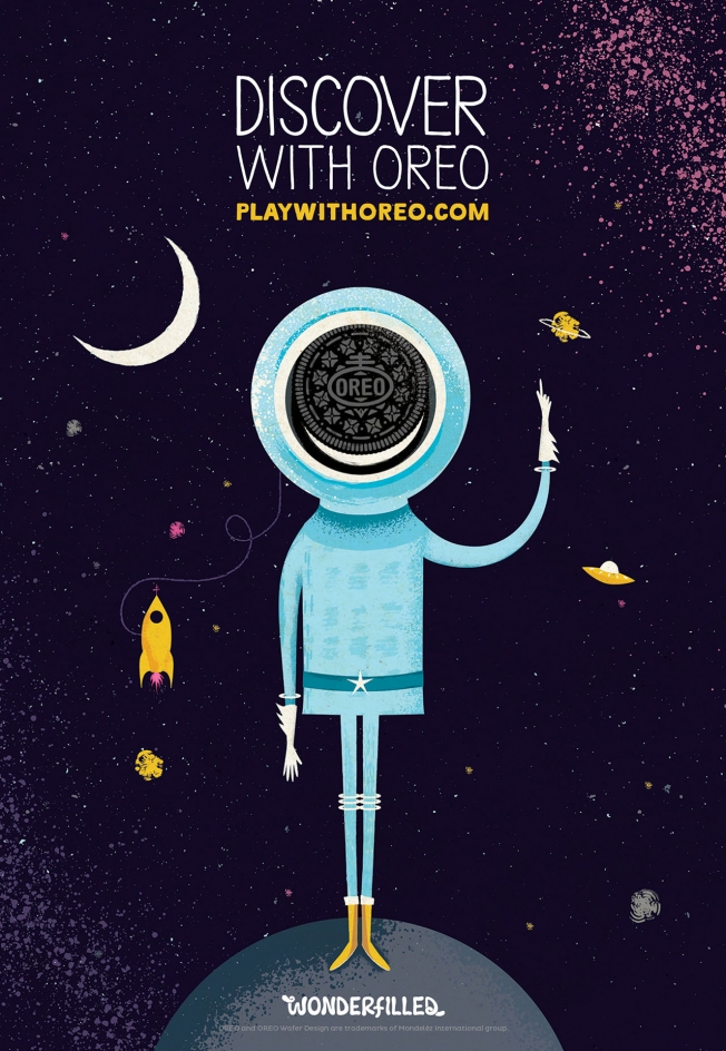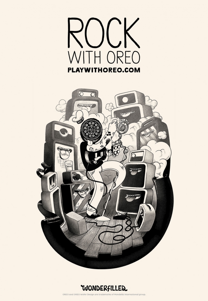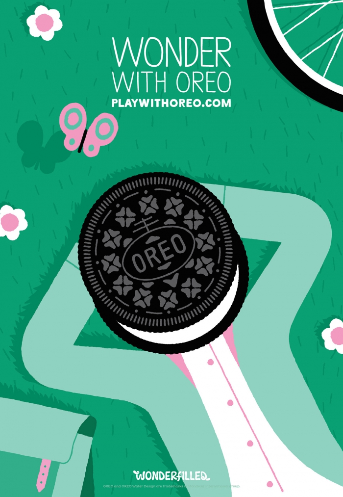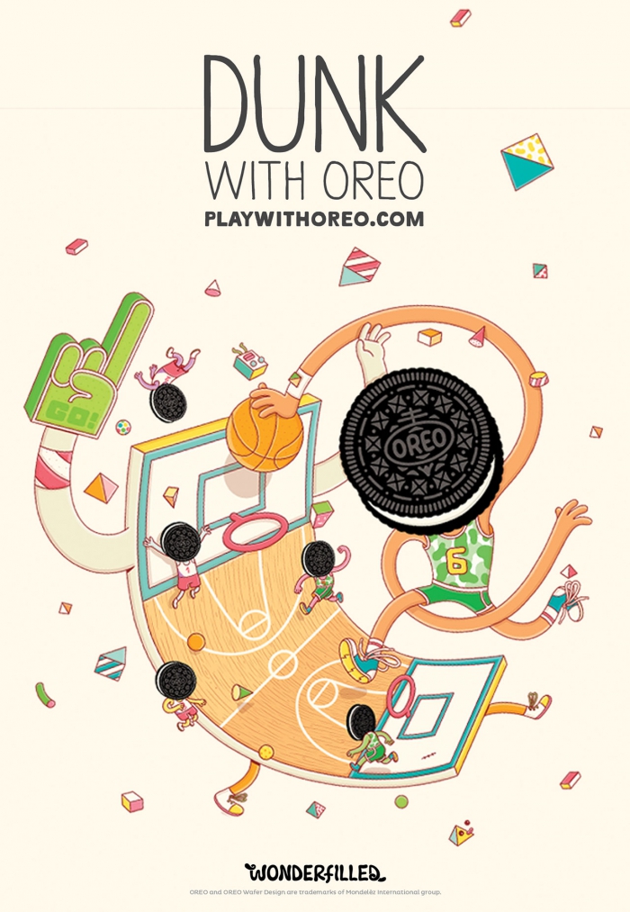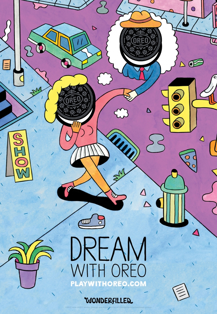 Американский бренд печенья Oreo (Mondelez International, Inc.) и креаторы агентства The Martin Agency пригласили молодых художников принять участие в разработке продолжения январской рекламной кампании "Поиграй с Oreo". 10 молодых художников со всего мира создали яркие и красочные принты, в которых изобразили свои ассоциации игры с Oreo.