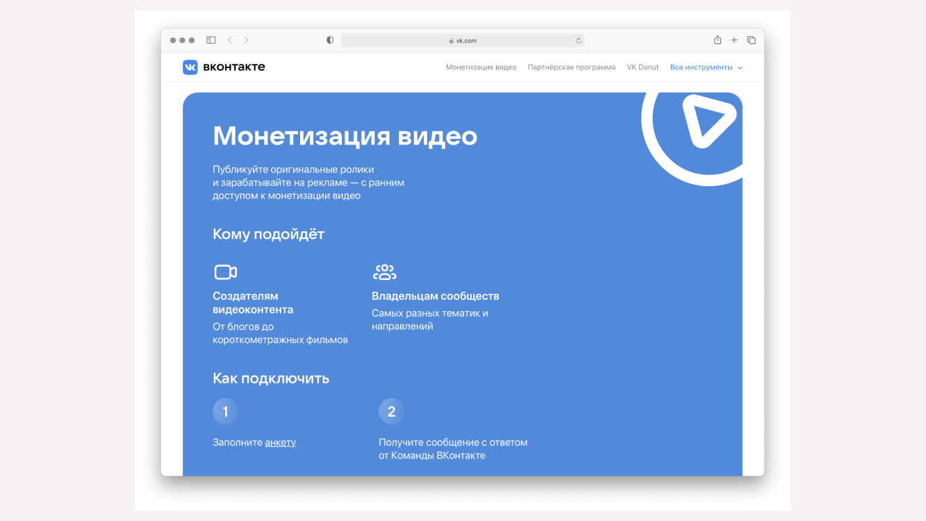 Авторы роликов могут присоединиться к тестированию в новом разделе «Монетизация ВКонтакте», где можно узнать о способах заработка на площадке, оценить возможный уровень дохода и подобрать подходящий инструмент для монетизации.