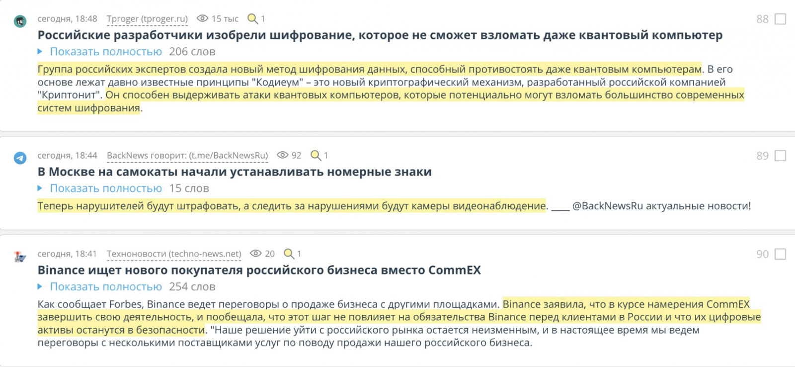 Другая проблема — не все материалы СМИ есть в печатном электронном виде. Например, телерадиоэфиры: многие редакции перерабатывают этот материал и публикуют в своих каналах. Мониторинг мессенджера опять же даст доступ к такому контенту и не позволит пропустить важное упоминание.