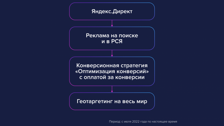 В итоге мы решили запустить кампанию с геотаргетингом на весь мир, а для соблюдения целевого CPA — подключить конверсионную стратегию с оплатой за конверсии.