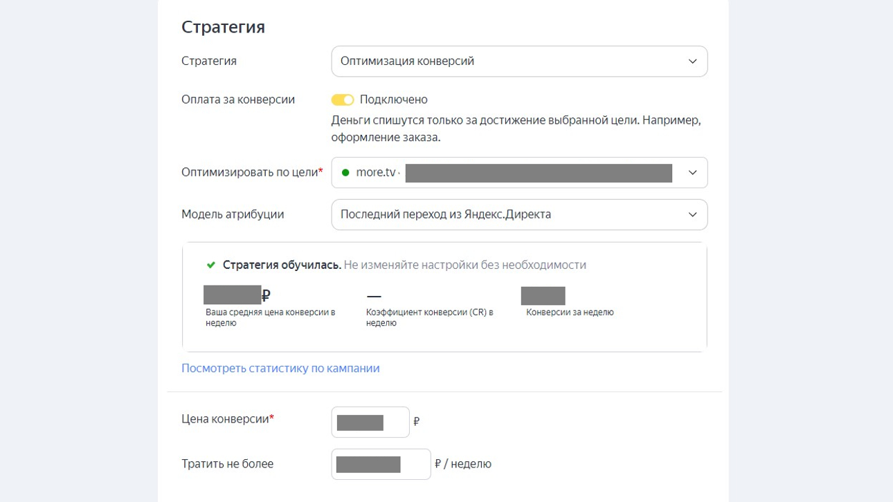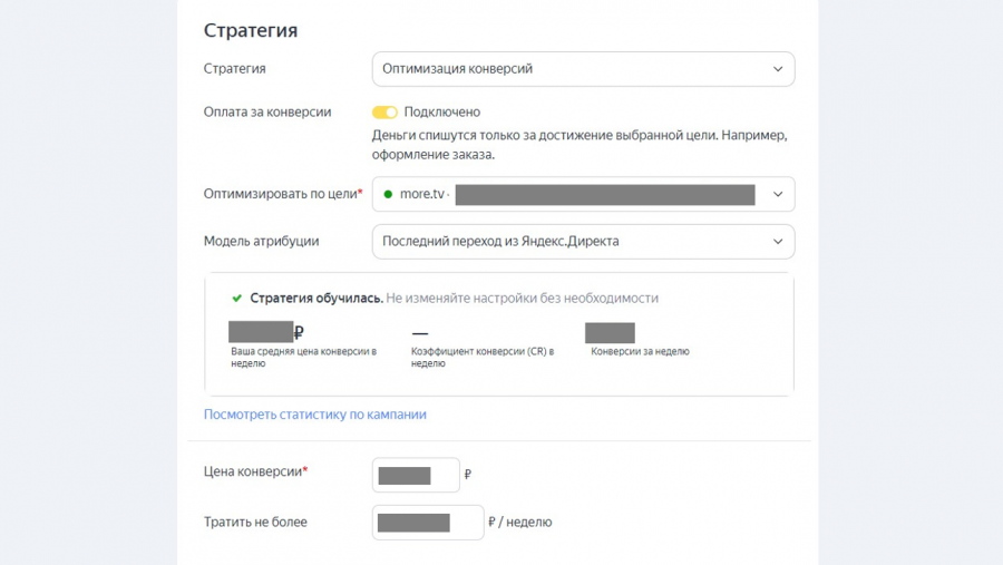 3. Подключили стратегию «Оптимизация конверсий» и установили tCPA.