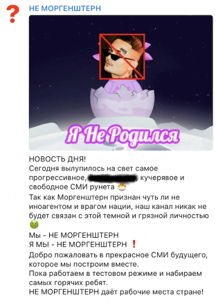 Telegram-канал называется «Не Моргенштерн». Артист заявил: «Так как Моргенштерн — чуть ли не иностранный агент и враг нации — мы решили никак с ним не ассоциироваться».