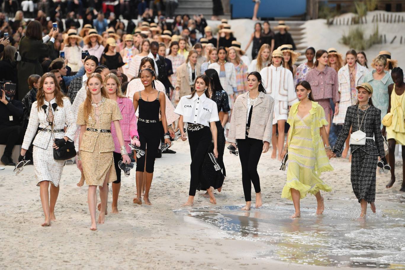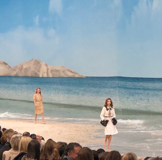 Под стеклянным потолком Grand Palais декораторы соорудили пляж с песком, мягкими плескающимися волнами, променадом и хижиной тики, а также пирс, на котором в финале показа появился Карл Лагерфельд.