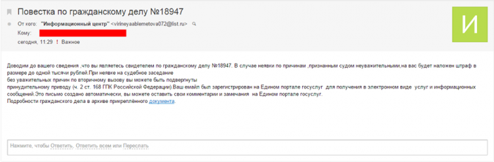 Например, в одном из писем содержалось требование явиться на судебное заседание в качестве свидетеля. С подробностями гражданского дела предлагалось ознакомиться в прикрепленном архиве. Портал госуслуг напомнил, что не занимается рассылкой повесток.