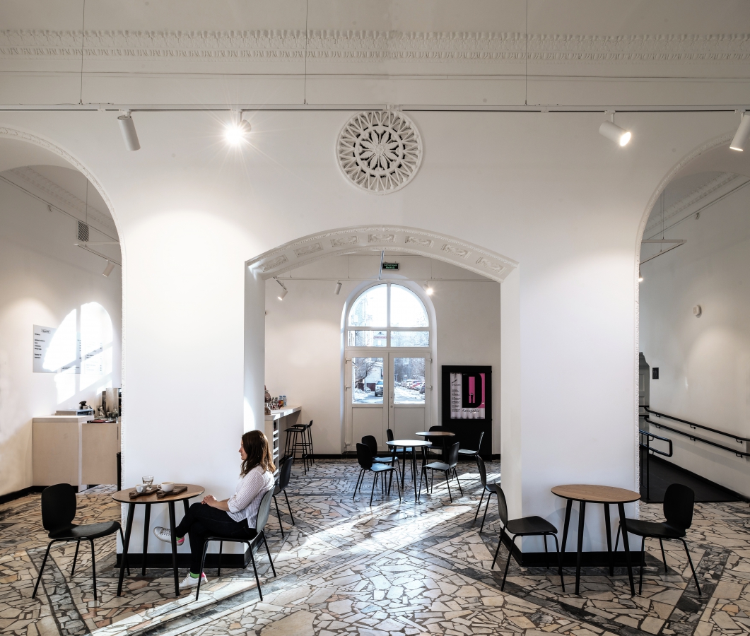 В фойе внимание зрителя акцентируется на элементах брендинга «Москино»: стенды афиш — не безликие картинки в рядах рамок, а экспонаты, занимающие должное место в интерьере, с расчетом на то, что даже массовые прокатные фильмы однажды вспомнят, что плакат — это искусство.