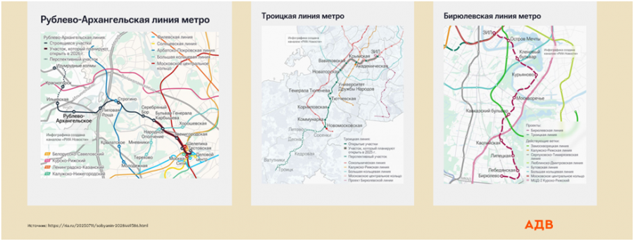 В ближайшие годы планируется строительство трех новых линий метро: Рублево-Архангельской, Троицкой и Бирюлевской. Как и в случае с предыдущими расширениями метрополитена, это приведет к активизации строительства и удорожанию жилья в соответствующих локациях.
