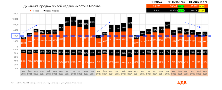Первый квартал 2025 года закрылся с ростом в 5% год к году благодаря интенсивному старту в январе-феврале. Однако уже в марте произошло нетипичное для этого периода охлаждение спроса, а во втором квартале снижение продолжилось. В мае объем сделок в старых границах Москвы составил менее 4 тыс. лотов. Из всех сегментов только элитный показывает рост по сравнению с аналогичным периодом 2024 года. В Новой Москве спрос вернулся к уровням 2023 года.