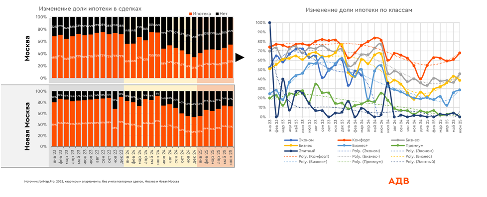 Доля ипотечных сделок продолжает расти во всех массовых сегментах. В Новой Москве, где преобладает комфорт-класс, этот показатель достиг 73%. Однако новые ограничения ЦБ, введенные с 1 июля 2025 года, могут сократить количество кредитов с низким первоначальным взносом, что потенциально уменьшит долю ипотечных сделок, одновременно повысив их качество.