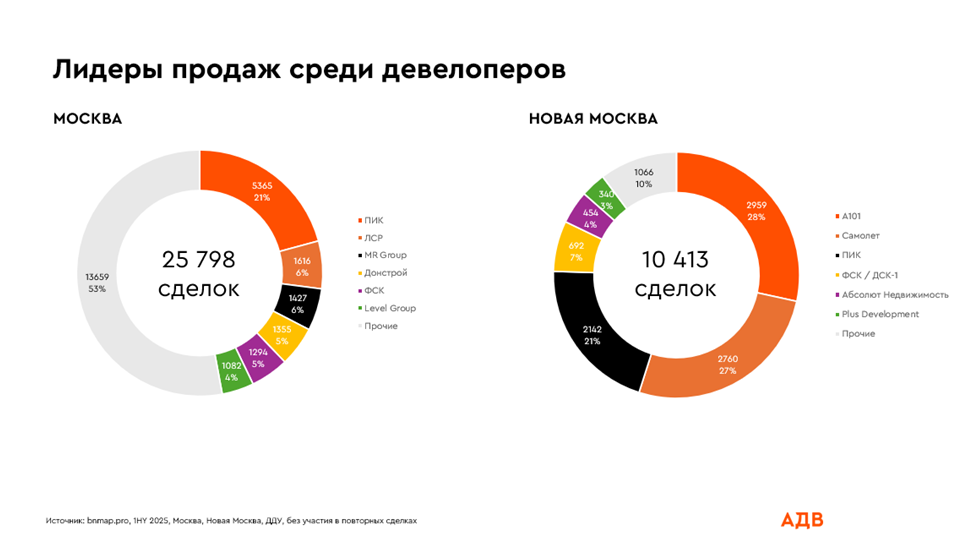 По объемам продаж в Москве среди конкурентов выделяется ПИК, остальные ТОП-девелоперы заняли равные доли рынка. В Новой Москве ситуация противоположная: лидерами стали А101, «Самолет», ПИК. Первые два занимают одинаковые доли рынка (погрешность 1%), ПИК продает чуть меньше. Совсем небольшая доля приходится на остальных девелоперов.