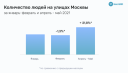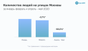 В январе и феврале 2020 число людей на улицах было почти одинаковым. В феврале просадка составила 3,7% — это объясняется тем, что дней в феврале меньше. А в апреле-мае прошлого года москвичи самоизолировались дома, спад составил 80,2%. По сравнению с январем и февралем 2021 года в апреле-мае число людей на улицах Москвы резко увеличилось — на 21,8%.