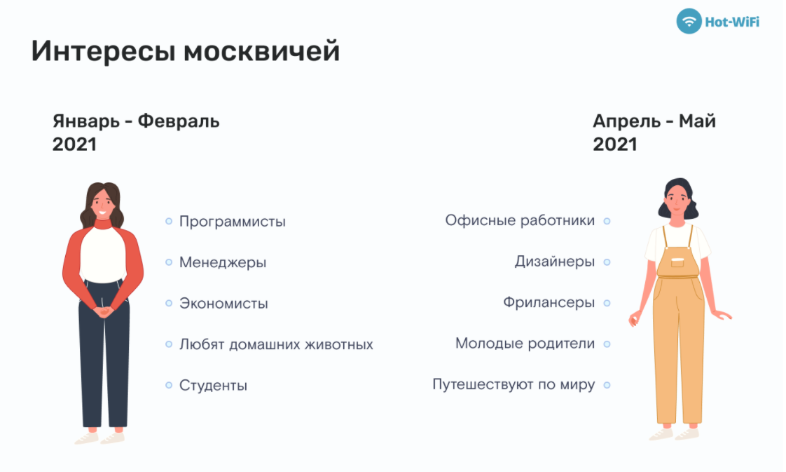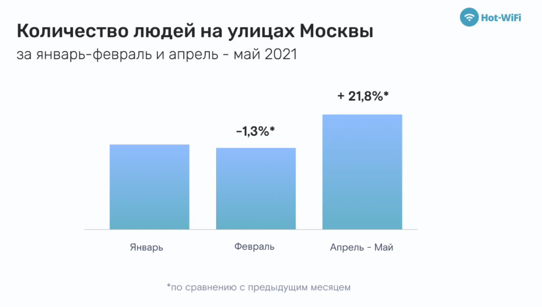 Данные были собраны в местах скопления людей, где установлен WiFi-Радар. Компания сравнила аудитории москвичей (мужчины и женщины 18−75 лет) за два временных промежутка — январь-февраль и апрель-май в 2020 и 2021 году.