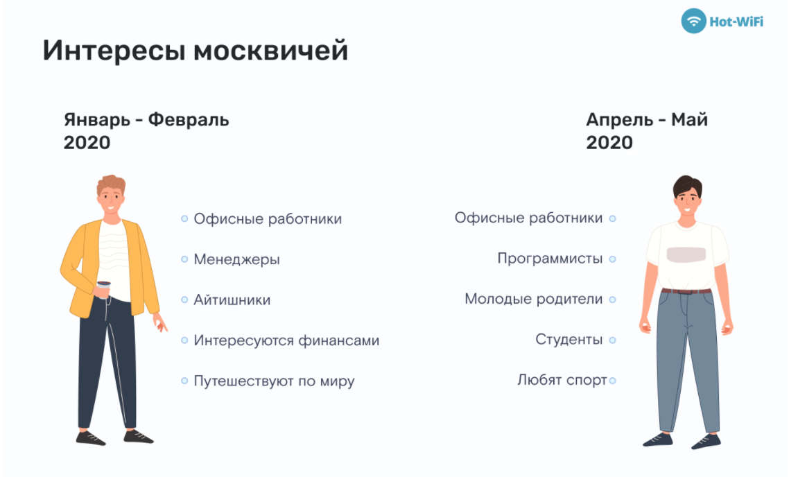 В январе и феврале 2020 года чаще всего среди прохожих можно было встретить офисных работников: айтишников, менеджеров и экономистов. В апреле-мае 2020-го эти данные практически не изменились, однако на улицах Москвы стало больше молодых родителей (прирост составил 20,7%) и студентов (+17,4%).