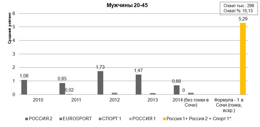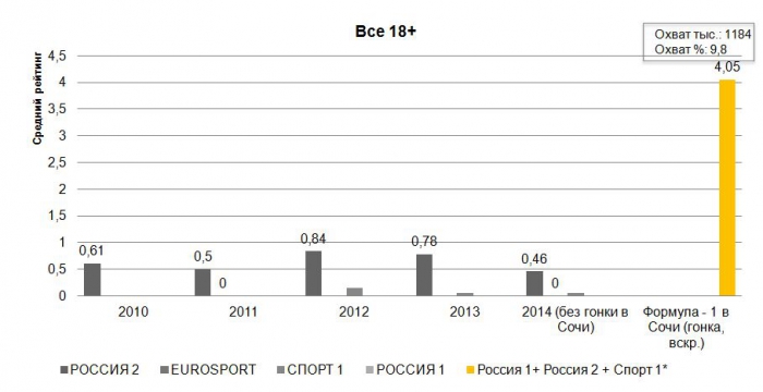 Финальную гонку «Формулы-1» в Сочи посмотрело 9,8% телевизионной аудитории в Москве. Соревнования впервые проходили в России, поэтому и вызвали гораздо больший интерес. Финальная гонка транслировалась в воскресенье сразу на трех телеканалах — «Россия 1», «Россия 2», «Спорт 1», средний рейтинг события составил 3,82 по аудитории «Все 18+», свидетельствуют данные TNS Media Research.