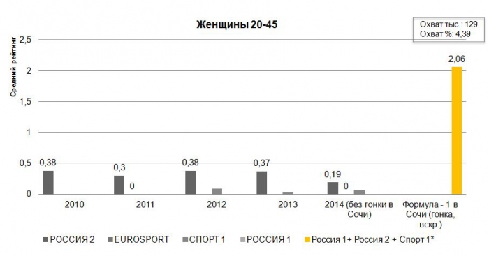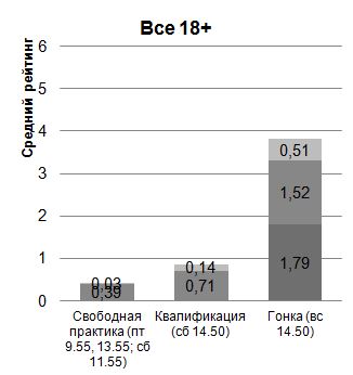 Ожидаемо, что финальная гонка была интереснее квалификации и свободного заезда. Причем большинство мужчин выбрали для просмотра «Россию 2», а женщины в равной степени смотрели на «Спорт 1» и «Россия 2». Подобный рейтинг на телеканале «Россия 1» имеют сериал «Узнай меня, если сможешь» и «Вести в Субботу», говорится в исследовании Havas Media.