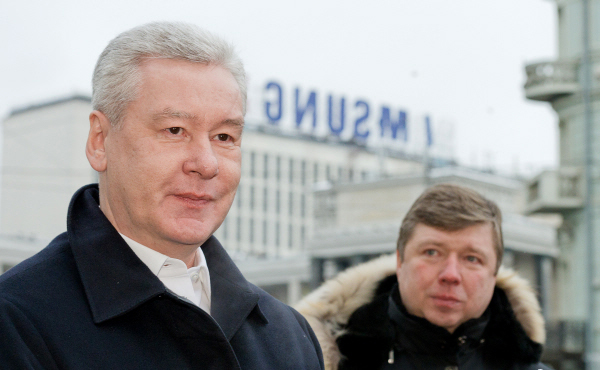 С.Собянин и В.Черников на фоне демонтажа рекламы Samsung. Фото РИА Новости