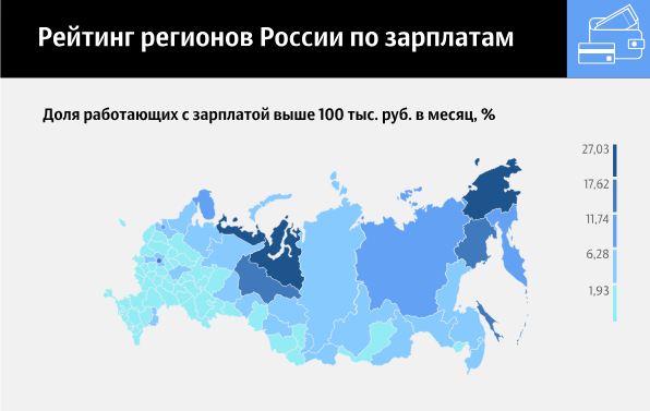 В целом по России зарплату более 100 тысяч рублей в месяц получают 4,4% работников. Для сравнения, зарплата половины россиян, по оценкам экспертов, не превышает 26,9 тысячи рублей в месяц. Каждый пятый работник получает менее 15 тысяч рублей в месяц. В 22 регионах более 33% людей зарабатывают меньше этой суммы.