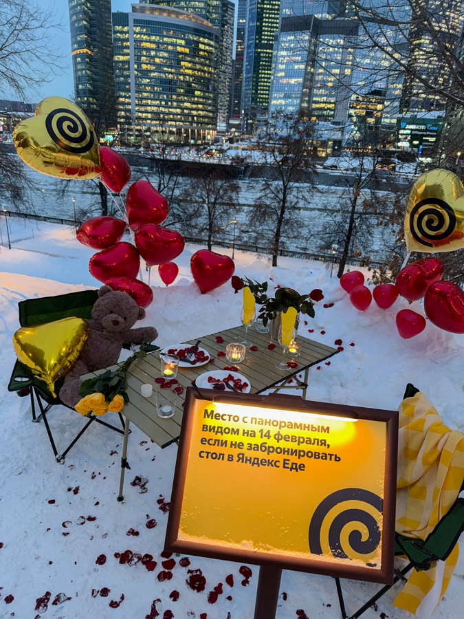В преддверии 14 февраля в Москве появились необычные инсталляции — импровизированные места свидания для тех, кто не успел забронировать столик в ресторане. Проект «Яндекс Еды» напоминает горожанам, что выбрать место для романтической встречи лучше заранее.