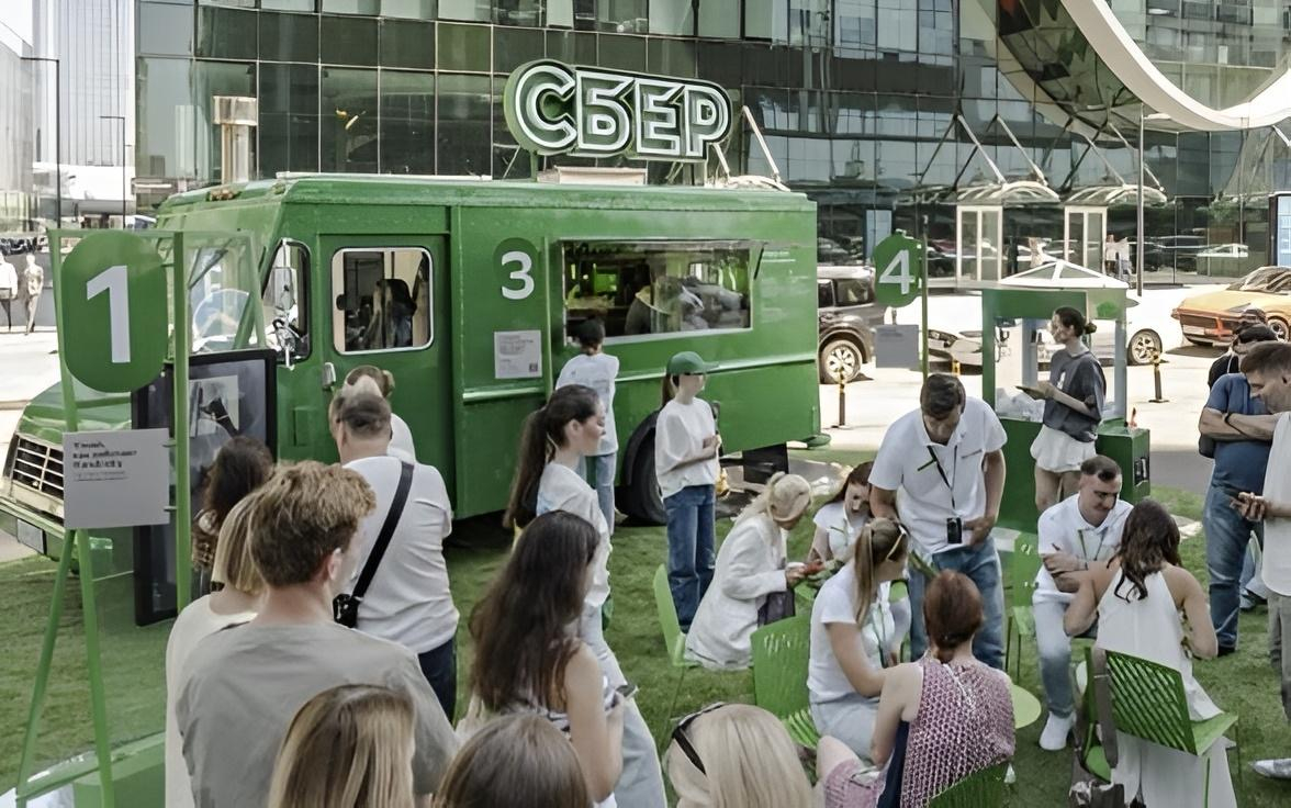 В «Сбере» придумали кардтрак — зеленый фургон, стилизованный под кофейню, в котором за несколько минут можно изготовить карту с уникальным дизайном. Несколько принтеров печатали дизайн, сгенерированный нейросетью Kandinsky. Рядом с кардтраком расположился интерактивный экран, который позволял не только выбрать уже готовый дизайн, но и сделать тестовый запрос для ИИ, поиграть с различными стилями и изображениями. Далее шел недолгий процесс оформления и получения карты. Пока клиенты ожидали изготовление своей карты, они могли вспомнить детство и испытать удачу в автомате-«хватайке» с более традиционным мерчем: картхолдеры, брелоки, пледы.