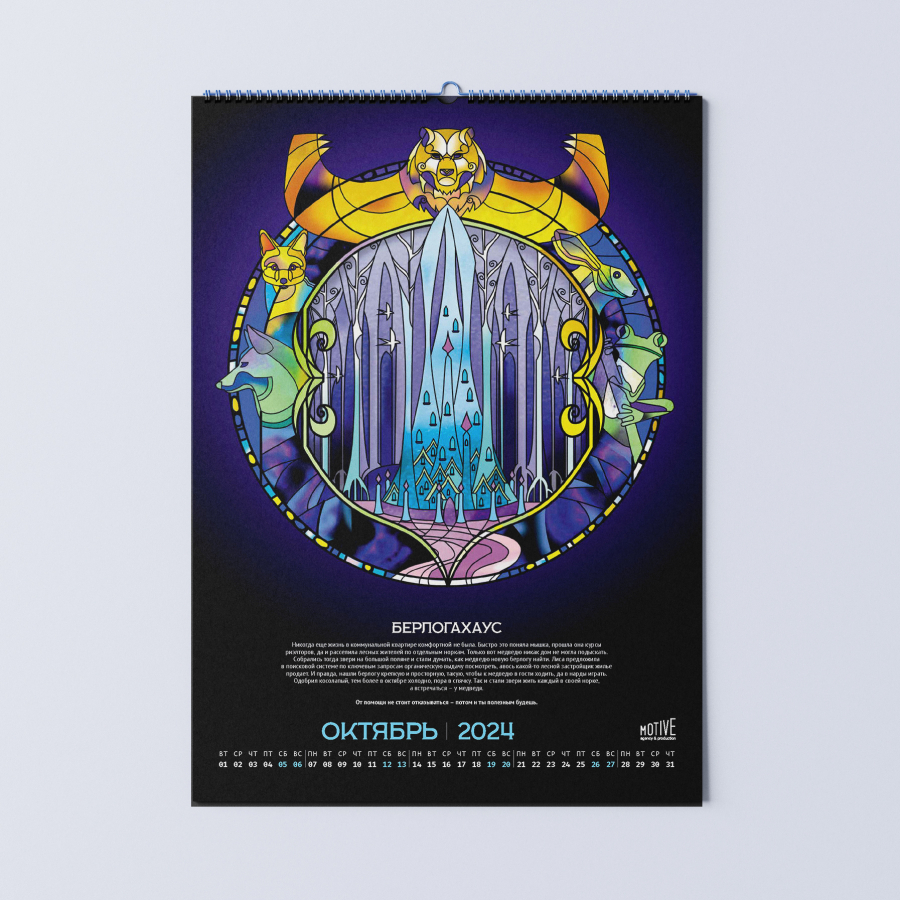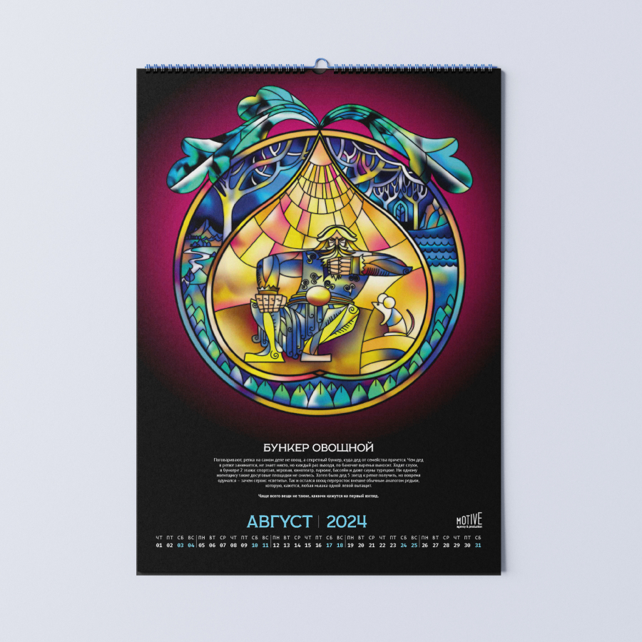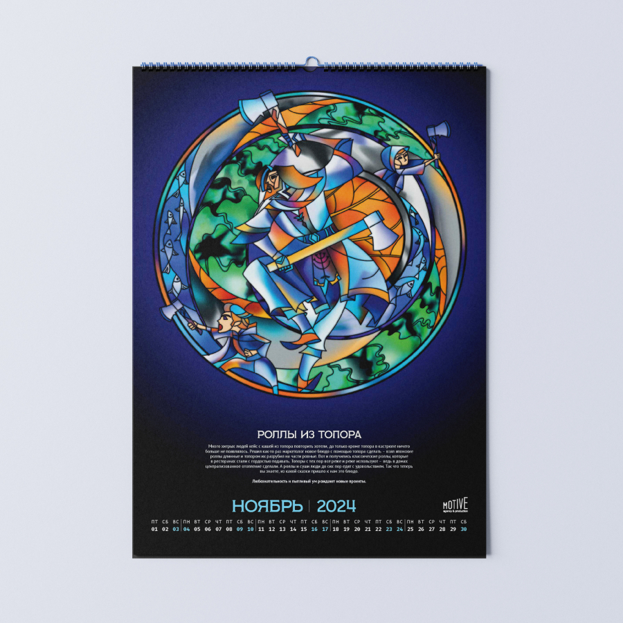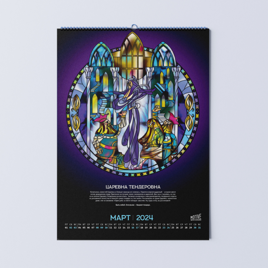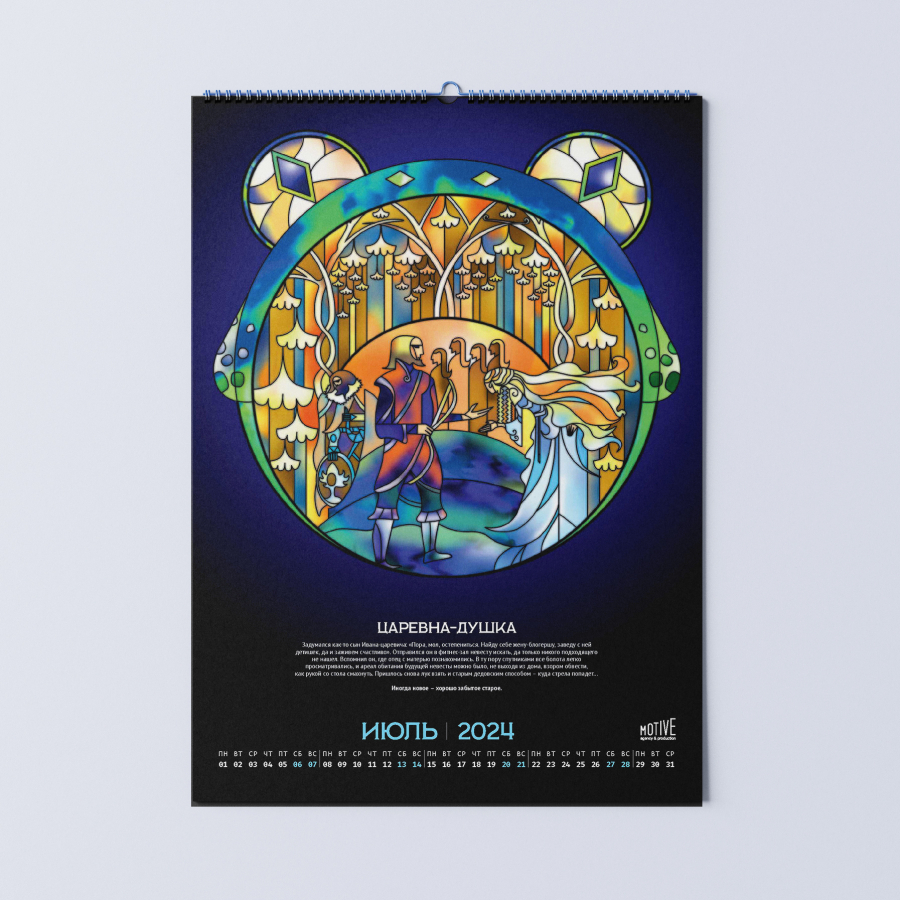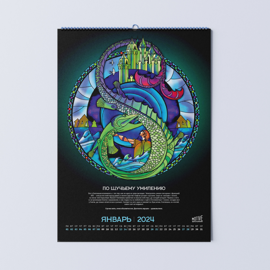 В процессе осмысления идеи мы перебрали много образов и стилей, вдохновлялись витражами в сериале КиШ, листали сказки с иллюстрациями Билибина, искали референсы с помощью ИИ. Хотелось сделать продолжение нашего предыдущего календаря, где мы успешно отразили футуристическую историю о будущем рекламных технологий. Календарь взял много наград и тираж разошёлся моментально: дарили коллегам, клиентам, приходилось несколько раз допечатывать и получили несколько новых заказов на дизайн корпоративных календарей. В новом проекте было огромное желание попробовать применить ИИ. Однако все решения нейросетей только расстраивали. То Емеля был слишком гламурный, то Кощей уродливый, то репка на дыню похожа. ИИ выдавал результат, который явно не дотягивал до уровня. И тогда мы единогласно решили — ничто не заменит руки нашего креативного дизайнера, поэтому над календарём работали с глубоким погружением всей большой командой.