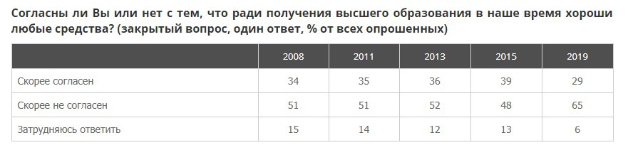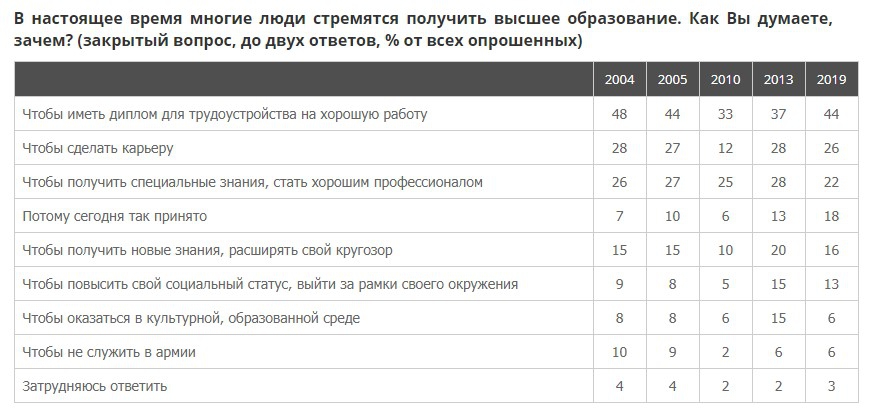 Наряду с этим укрепляется скептический настрой в отношении высшего образования как обязательного условия удачной карьеры. Растёт число тех, кто считает, что отсутствие высшего образования обрекает их на низкооплачиваемую и непрестижную работу. А то, что образование оказывает существенное влияние на материальное благополучие человека, считает 70% респондентов.