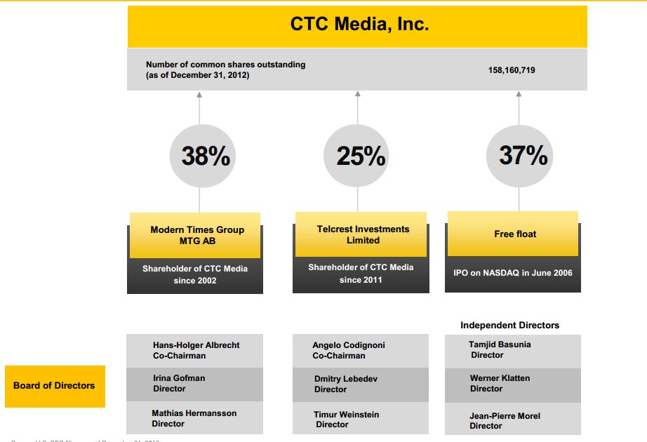 Modern Times Group MTG AB принадлежит 38% акций CTC Media, Telcrest Investments Ltd. – 25%, еще 37% находится в свободном обращении на бирже. В 2012 года операционная выручка медиахолдинга составила 804,9 млн долларов.