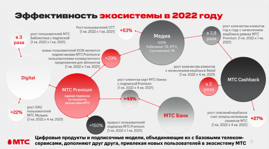 Общее количество абонентов платного ТВ (спутниковое, кабельное, IPTV, OTT) выросло в первом квартале на 8,3% в годовом исчислении, до более 9 млн пользователей. Количество пользователей ОТТ-платформы платного ТВ МТС в первом квартале 2022 года показало рост на 63% год к году, до 4,7 млн пользователей.