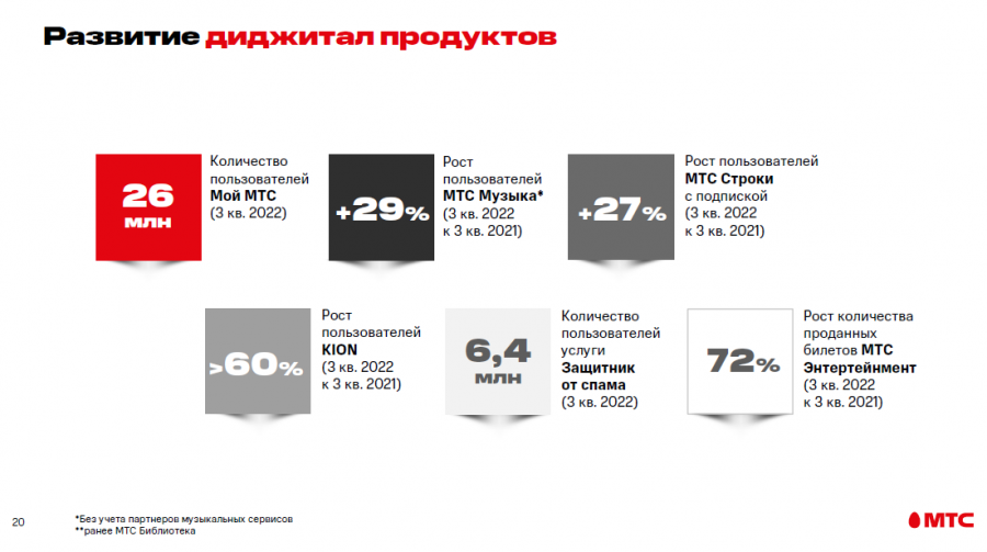 Важно отметить продолжающийся рост наших цифровых направлений — Kion, МТС Entertainment, МТС Music, «МТС Строки» и других. Мы также продолжаем инвестировать в новые направления, такие как МТС Travel, «умный дом»,