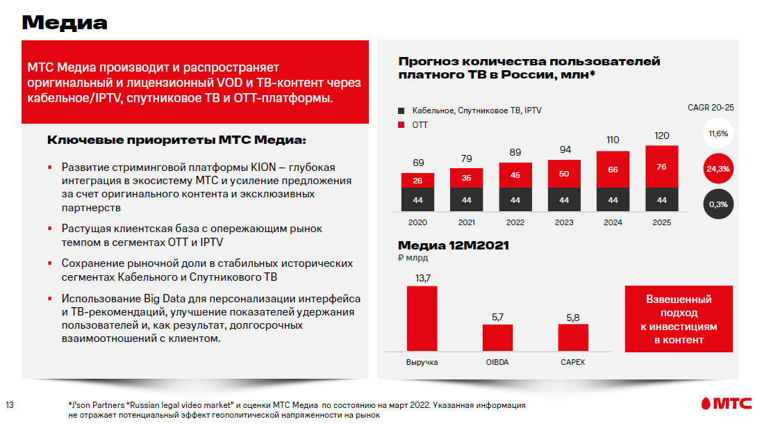 Количество пользователей Kion увеличилось на 15% квартал к кварталу до 5,7 млн по состоянию на конец 30 сентября 2022 года. Общее количество абонентов платного ТВ (спутниковое, кабельное, IPTV, OTT) выросло на 8,4% квартал к кварталу до 10,1 млн на конец третьего квартала 2022 года.