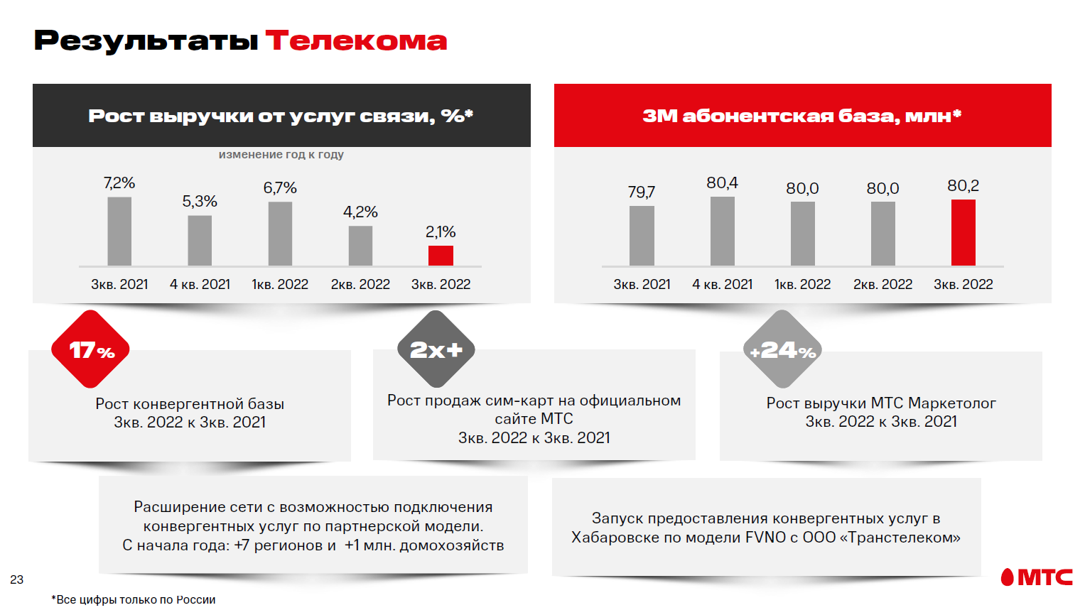 Выручка от услуг связи компании в России в третьем квартале 2022 года выросла на 2,1% год к году до 110,3 млрд руб. Абонентская база в РФ незначительно увеличилась квартал к кварталу и составила 80,2 млн абонентов, указано в отчёте.