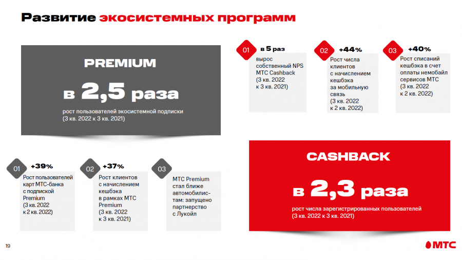 Количество экосистемных клиентов МТС (используют два и более сервиса или услуги различных категорий) возросло до уровня 12,8 млн на конец третьего квартала, что на 63% выше показателя за аналогичный период прошлого года. Показатель среднего количества продуктов экосистемы на одного клиента увеличился с 1,39 в третьем квартале 2021 года до 1,58 в третьем квартале 2022 года.