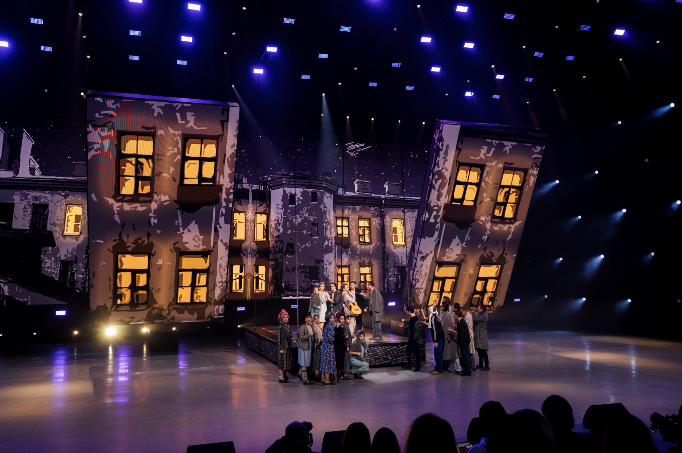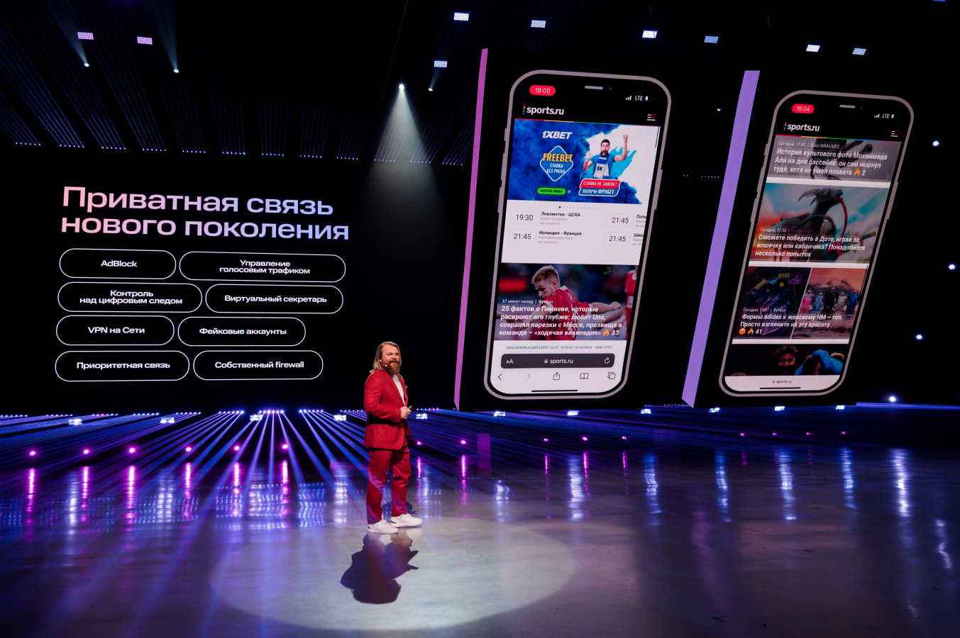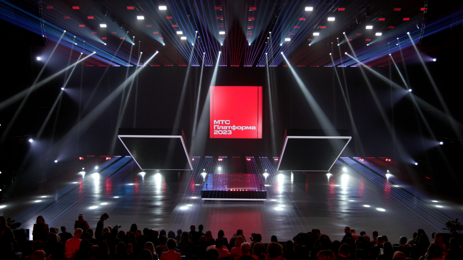 С первой минуты интро-шоу зритель в прямом смысле слова оказался на пересечении двух миров, где продукты и сервисы, существующие только в цифре, работают и приносят пользу реальным людям в реальном мире. Сцены, свет, архитектура площадки и графика на экранах иллюстрировали взаимодействие частей экосистемы МТС.