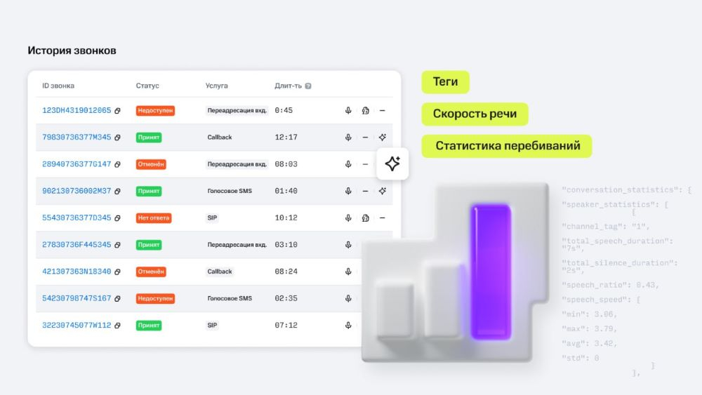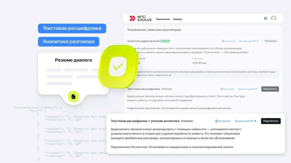 Благодаря интеграции с сервисом речевой аналитики Yandex SpeechSense пользователи МТС Exolve могут собирать статистику диалога, получать проанализированный нейросетью разговор с клиентом, извлекать в виде резюме ответы на наиболее значимые в обслуживании вопросы: решена ли проблема клиента, был ли оператор вежлив, удовлетворён ли клиент