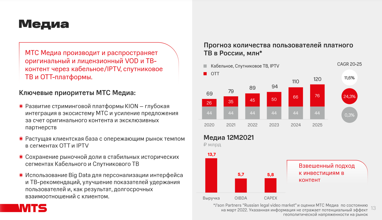 Количество пользователей OTT-платформы увеличилось на 4,8% квартал к кварталу до 4,9 млн по состоянию на конец второго квартала. Общее количество абонентов платного ТВ (спутниковое, кабельное, IPTV, OTT) выросло на 3,4% квартал к кварталу до 9,3 млн.