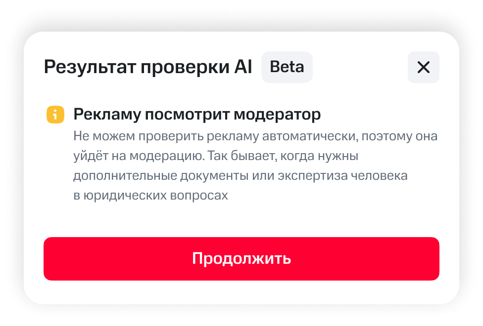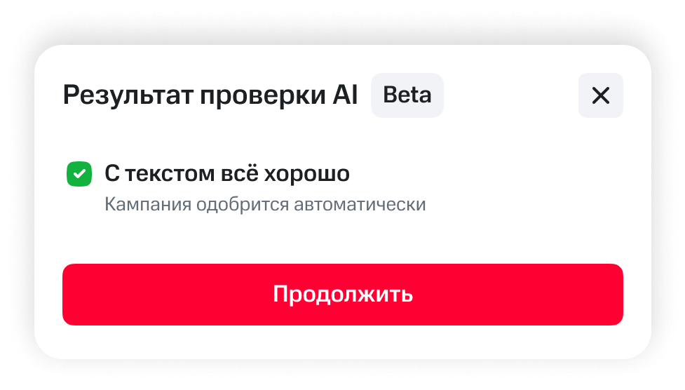 Если в тексте нет ошибок, рекламная кампания будет одобрена и запущена автоматически. Если ошибки есть, ИИ-модератор подскажет, что поправить. После исправления ошибок объявление проверяется повторно. Спорные случаи направляются на ручную проверку специалисту МТС AdTech.