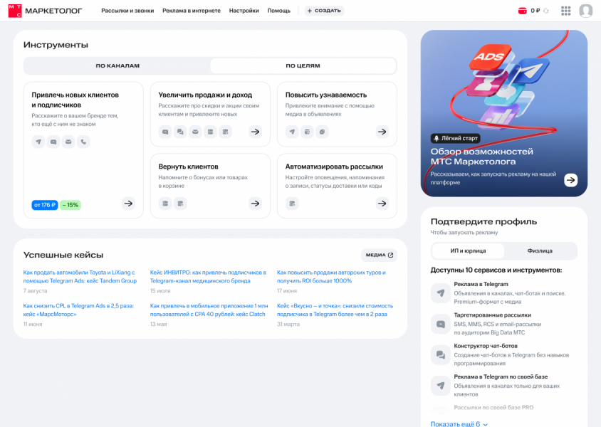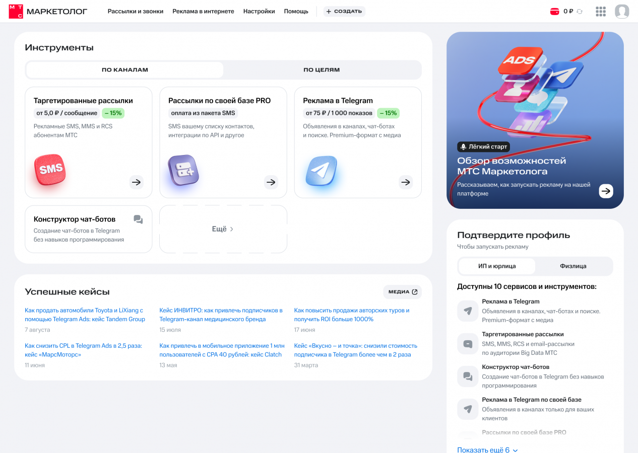 На главной странице инструменты теперь сгруппированы по каналам и целям — так проще выбрать подходящий сценарий. В разделе «По каналам» в одном из блоков доступен запуск таргетированных SMS/MMS/RCS-рассылок как на агрегированные и обезличенные сегменты Big Data МТС и партнеров, так и на собственную клиентскую базу. В другом блоке возможен запуск рекламы в Telegram Ads в текстовых и премиум-форматах с баннером и видео без минимального порога бюджета для МСБ.