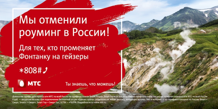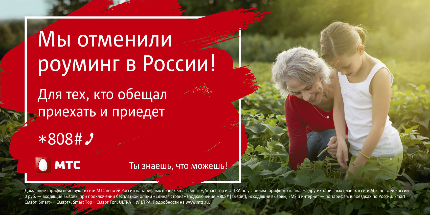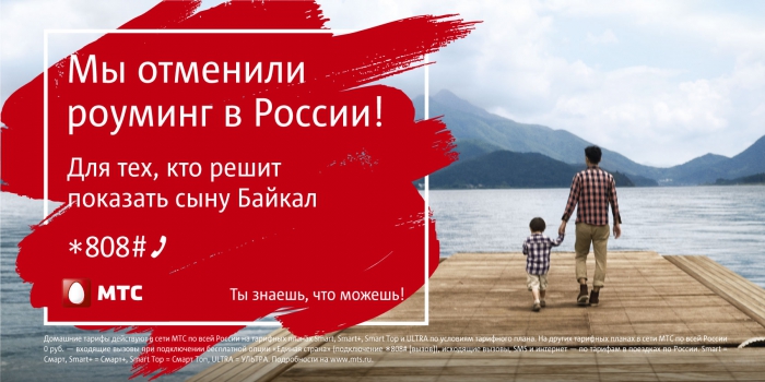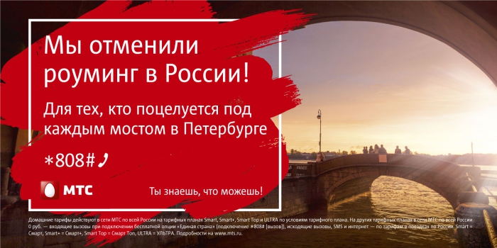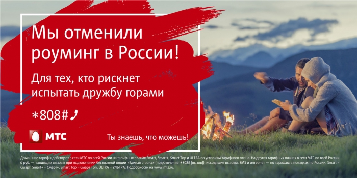 Федеральная рекламная кампания «Мы отменили роуминг в России!» стартовала в России и странах СНГ. В рамках кампании задействованы ТВ, радио, интернет, наружная реклама, аэропорты, метро, плазменные панели в торговых центрах, на заправках, салоны МТС.