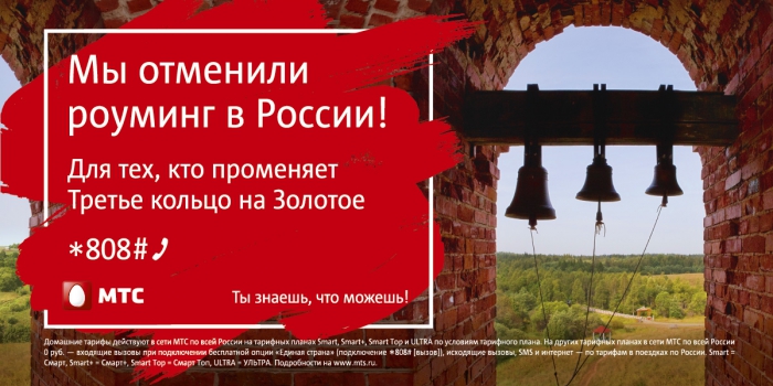 Телекоммуникационный оператор МТС запустил рекламную кампанию в поддержку новой тарифной опции «Единая страна», которая дает возможность абонентам общаться во внутреннем роуминге бесплатно. Креативная концепция проекта разработана командой BBDO Moscow под управлением Николая Мегвелидзе. В рамках кампании оператор представил впечатляющий видеоролик с красотами России и рекламные принты.
