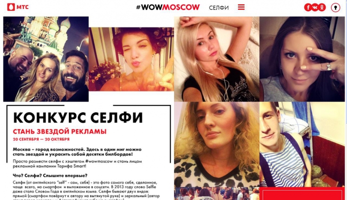 МТС объявил о проведении конкурса селфи, победители которого станут лицом рекламной кампании тарифа Smart уже в декабре. Конкурс стартовал в рамках проекта WOWMOSCOW. До 20 октября москвичам предлагается размещать свои фотографии с хэштегом #wowmoscow в социальных сетях или на сайте проекта.