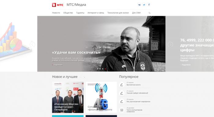 Основные разделы МТС/Медиа – «Новости», «Гаджеты», «Интернет и сети», «Технологии для жизни», «Общество». МТС/Медиа реализован в актуальном плиточном дизайне. Лента новостей, рубрикатор по ключевым темам и система тегов позволяют читателю легко ориентироваться в контенте. Ресурс полностью интегрирован в существующие площадки МТС в социальных сетях, совокупная аудитория подписчиков которых превышает 1,6 млн. пользователей.